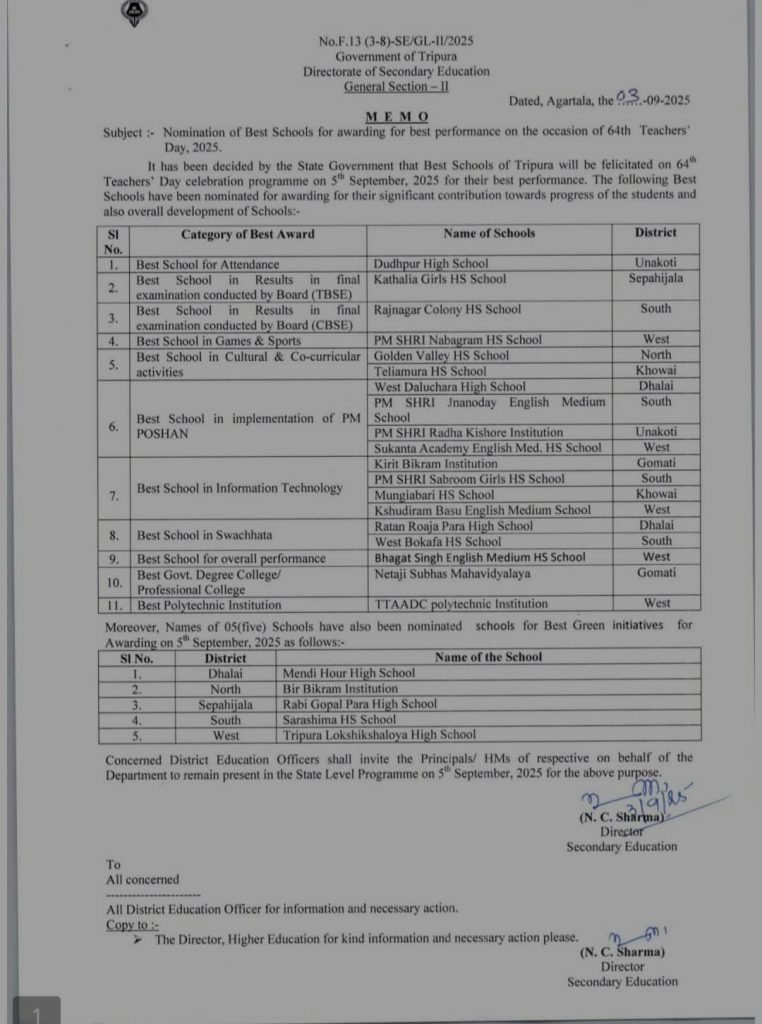 চমকপ্রদ হলেও সত্যি, রাজ্যের আটটি জেলার বিভিন্ন স্কুল ও শিক্ষকরা সম্মাননার দাবিদার হলেও তালিকায় নেই খোয়াই সদর মহকুমার কোনও বনেদী স্কুলের নাম। বরং জেলার প্রান্তিক এলাকার মুঙ্গিয়াবাড়ী দ্বাদশ শ্রেণি বিদ্যালয় ইনফরমেশন টেকনোলজি বিভাগে জায়গা করে নিয়েছে। কিন্তু খোয়াই সরকারি দ্বাদশ শ্রেণি বিদ্যালয় কিংবা খোয়াই সরকারি দ্বাদশ শ্রেণি (বালিকা) বিদ্যালয়ের নাম এই তালিকায় অনুপস্থিত। উল্লেখযোগ্য, প্রথম স্কুলেরই দ্বিতলে জেলা শিক্ষা আধিকারিকের কার্যালয় এবং দ্বিতীয়টির পাশেই বিদ্যালয় পরিদর্শকের অফিস। এছাড়া রয়েছে খোয়াই সরকারী ইংরেজী মাধ্যম বিদ্যালয়ের নামও। স্কুলগুলো বিদ্যাজ্যোতি প্রকল্পের আওতায় রয়েছে।
